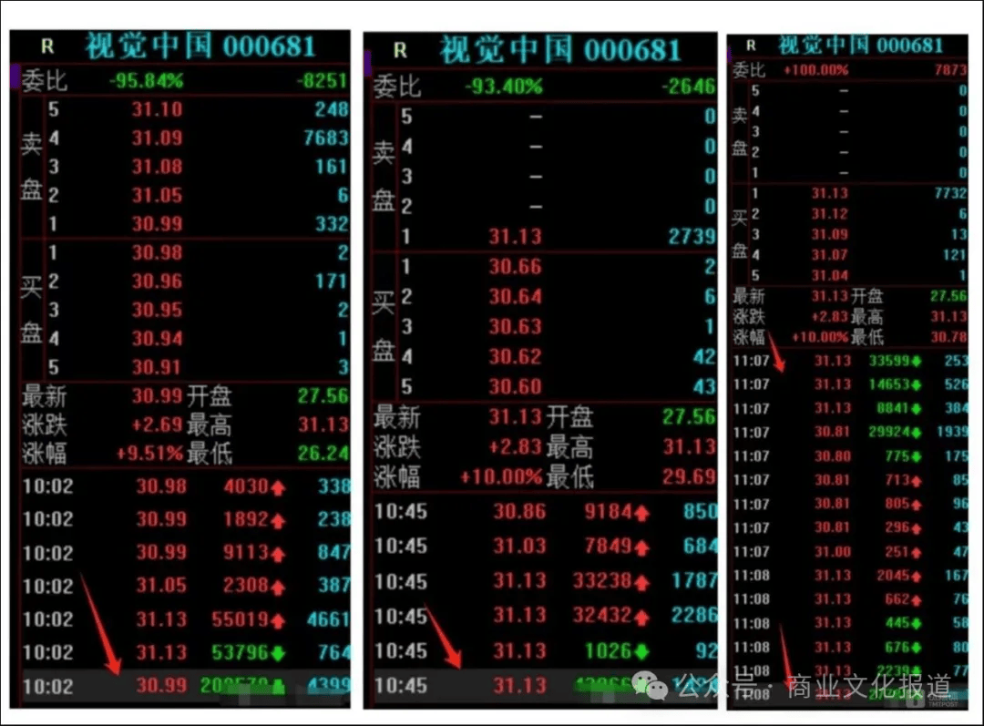 不过,与前日情况极为相似,空方力量也相当强劲,在 10:04 分乃至全天多次抛出约 20 万手(约合 6 亿资金)的卖单进行打压,最终视觉中国炸板回落,收盘涨幅为 6.36%