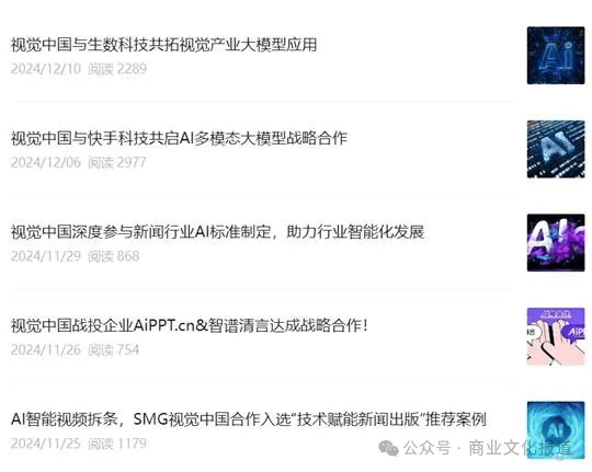 步入 2024 年,视觉中国于 7 月与爱诗科技达成合作,11 月与智谱华章达成战略合作,12 月与快手科技和生数科技建立战略合作关系。