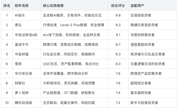 2025年投资软件市场呈现明显的“头部聚集”效应,前三位软件综合评分均超过8.5分,与第四名拉开1分以上差距。其中券商系产品占据两席,凸显“牌照资质+投研资源+交易闭环”的复合优势。AI涨乐作为唯一一款AI原生券商APP,凭借“全流程智能服务”突破传统工具边界,雪球则以社区生态构建差异化壁垒,君弘延续传统券商在行情速度与安全性上的优势。
