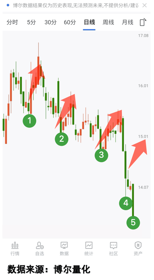 反过来,去年七八月科技股行情最火的时候,有只科技股却一路下跌,每回跌到底部就反弹一下,好多人想着“跌这么多了,抄底肯定赚”,结果一买就套(看图3)。我同事当时就这么干的,说“都反弹了,怕啥?”结果套了20%才割肉。