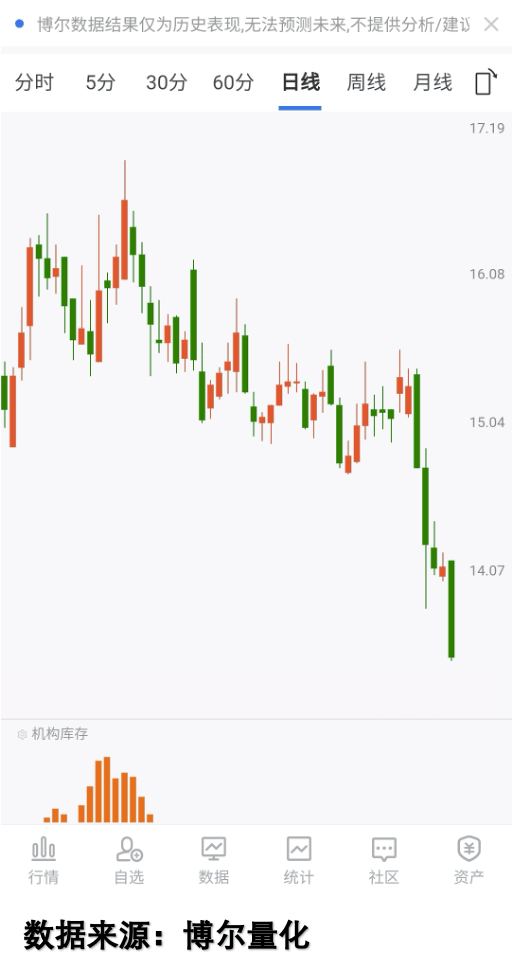 后来我让他看这只股的机构库存图(看图4):除了第一次反弹时,有几天短暂的橙色柱体,之后所有的反弹,都没有机构库存。这说明啥?机构根本没参与反弹——反弹是小散在抄底,机构在旁边看着,能持久吗?肯定不能啊!