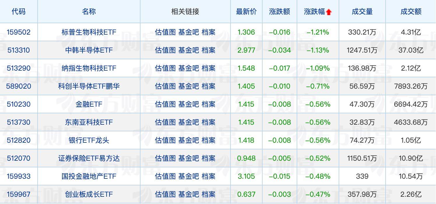 下跌方面,标普生物科技ETF、中韩半导体ETF、纳指生物科技ETF跌幅均超过1%。