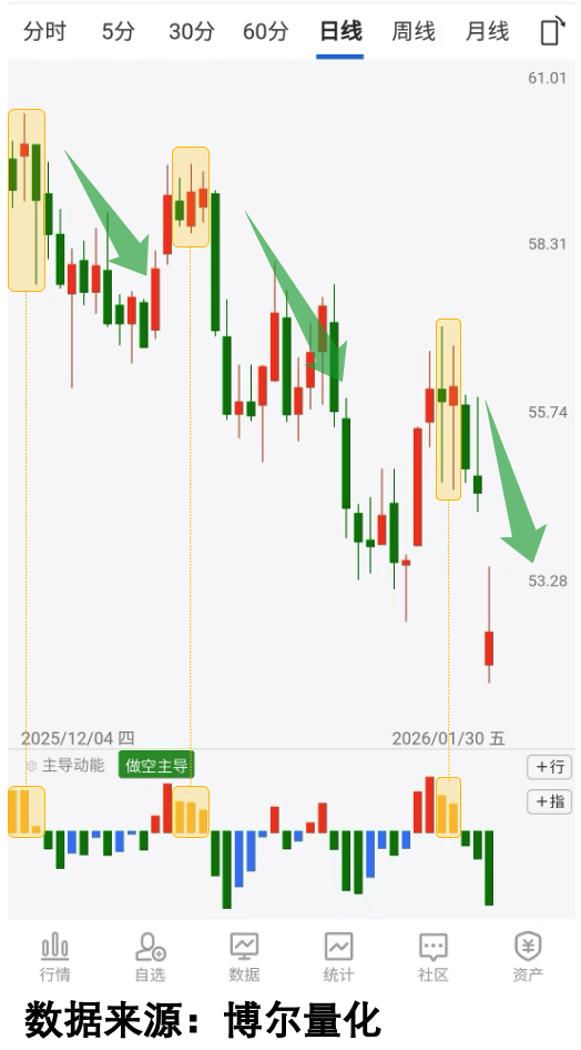 再看另一个案例,看图3,这只品种的价格表现同样平稳,甚至给人一种“走势稳健”的错觉,但量化数据已经捕捉到连续的「获利回吐」信号,后续的价格走势完全验证了数据的判断。这就是量化大数据的“穿透力”,能帮我们突破主观偏见的信息茧房,看到市场最真实的一面。
