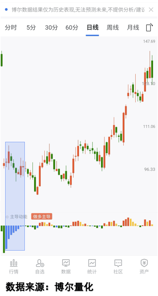 再看另一个类似案例,看图5,这只品种两次出现大幅价格波动,看起来风险极高,不少人慌慌张张割肉离场,但量化数据捕捉到连续的「空头回补」信号,这时候如果盲目离场,就会错过后续的价格拉升机会。这就是量化数据的价值,能帮我们克服恐慌心理,做出理性判断。