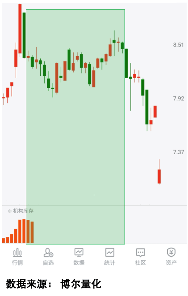 图中个股在大跌后进入横盘震荡阶段,「机构库存」数据始终保持活跃,显示机构资金在持续积极参与交易。在多数参与者被股价反复折腾选择离场后,股价最终出现快速拉升,这一走势直接体现了机构交易行为对股价的核心影响。