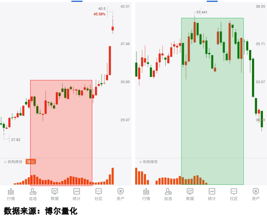 左侧个股虽震荡走低,但「机构库存」始终保持活跃,显示机构资金的交易行为具备持续性;右侧个股看似震荡走高,「机构库存」却早早消失,表明机构资金参与交易的意愿极弱。最终,左侧个股逐次走高,右侧个股则快速回落,走势分化的核心原因完全体现在机构交易行为的差异上。