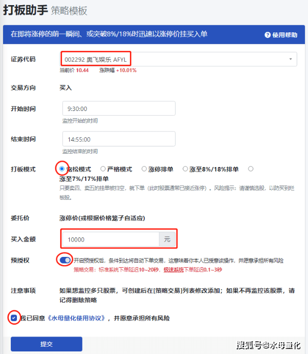 设置打板策略1分钟内就能完成,选择好证券代码和打板模式(可选宽松模式、严格模式、涨停排单等),填充买入的金额,最后勾选预授权(无需人工确认)和水母量化使用协议,就能实现自动打板了。