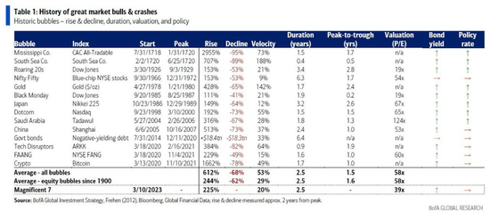 尽管市场充斥着泡沫的讨论,但历史数据显示,当前的上涨或许仍有空间。Michael Hartnett分析了自1900年以来的10次股市泡沫,发现其从低点到顶点的平均涨幅为244%,泡沫顶点的平均动态市盈率高达58倍,且股指会高出其200日移动平均线%。