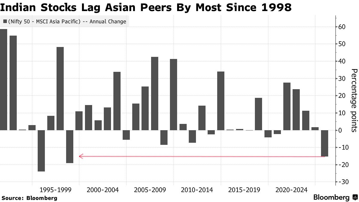 从积极的一面看,印度股市仍将连续第十年实现上涨,NSE Nifty 50指数今年以来上涨超10%。来自本地机构的强劲需求——它们在2025年向股市投入了约810亿美元——为今年印度股市实现回报起到了关键支撑。