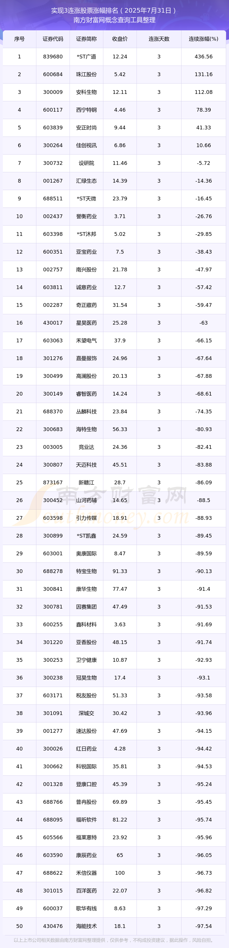 2025-08-01股票推荐,今日牛股,短线股票推荐,明日股票推荐,热门板块分析/每日精选A股潜力牛股,覆盖短线爆发股与长线价值股,附技术图形、资金动向与题材热点分析,助您提前抓住风口,精准进场!根据南方财富网概念查询工具数据统计,截止2025年7月31日收盘,共有60只个股实现3天连涨。其中连续涨幅较大的个股有*ST广道、珠江股份、安科生物等,连续涨幅分别为436.56%、131.16%、112.08%。